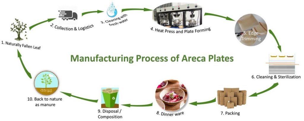 In India, Karnataka has the largest number of Areca palm tree cultivation. Farmers collect the sheaths and separate them from the leaf. After the separation, the farmers send the sheaths to Areca leaf merchants.